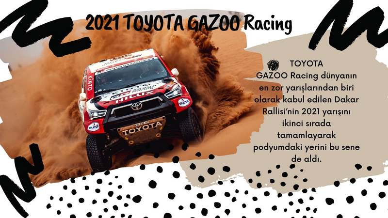 TOYOTA GAZOO Racing dünyanın en zor yarışlarından biri olarak kabul edilen Dakar Rallisi’nin 2021 yarışını ikinci sırada tamamlayarak podyumdaki yerini bu sene de aldı. 2019 şampiyonu olan Toyota, bu yıl mücadeleyi yine son etaba kadar bırakmadı.
